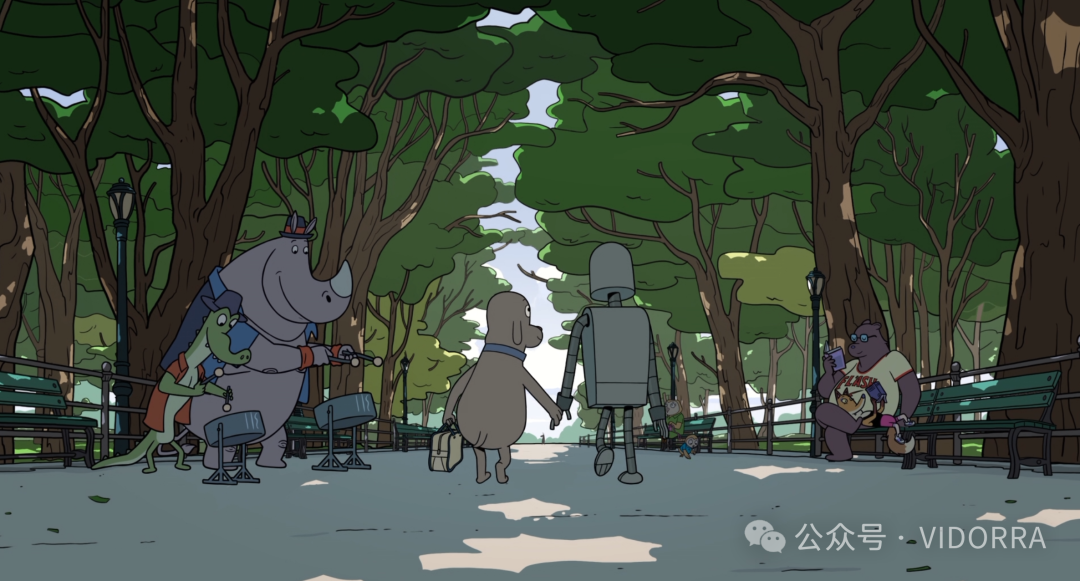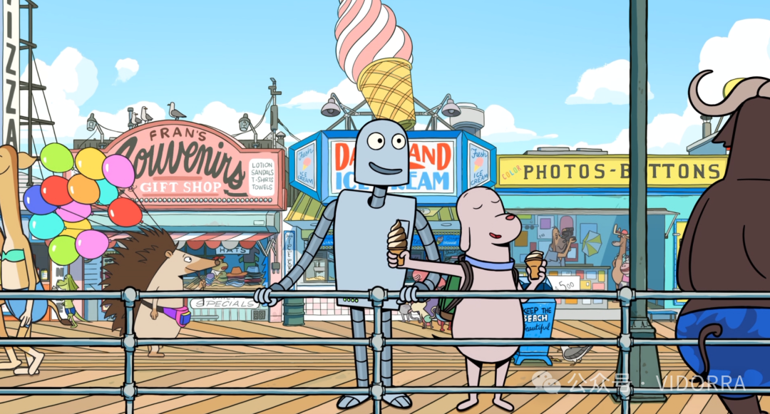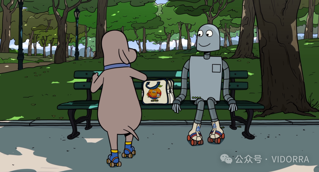 当语言被抽离,情感反而变得更加纯粹。小狗和机器人的关系,不需要通过对话来确认,他们只是在一起,做一些简单的事情:逛街、牵手、听音乐、轮滑、跳舞。这些动作本身就是陪伴的全部意义。